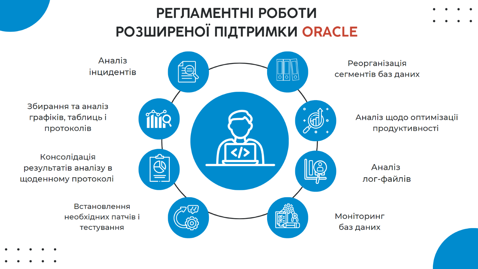 З метою контролю стану та роботи СКБД та підтримки її в актуальному стані наші спеціалісти беруть на себе щоденне та планове виконання задач: