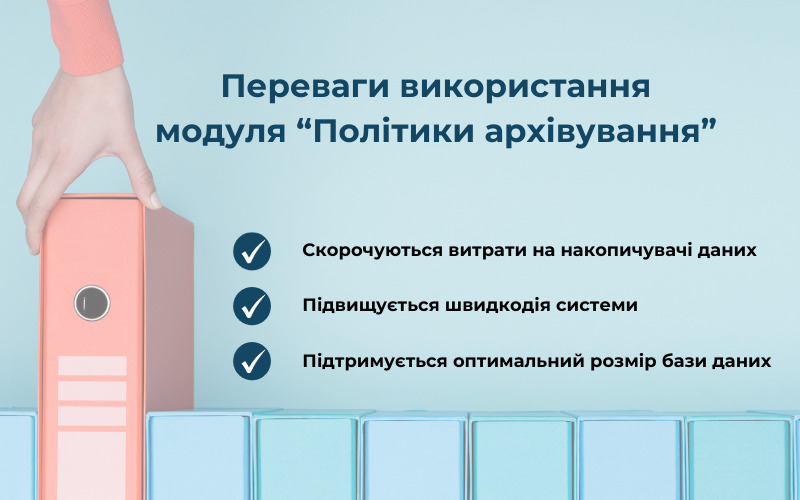 Модуль “Політики архівування” вирішує цю проблему, визначаючи перелік правил та автоматизуючи архівування (перенесення на окремий сервер чи носій даних) або ж видалення даних, що втратили свою актуальність.